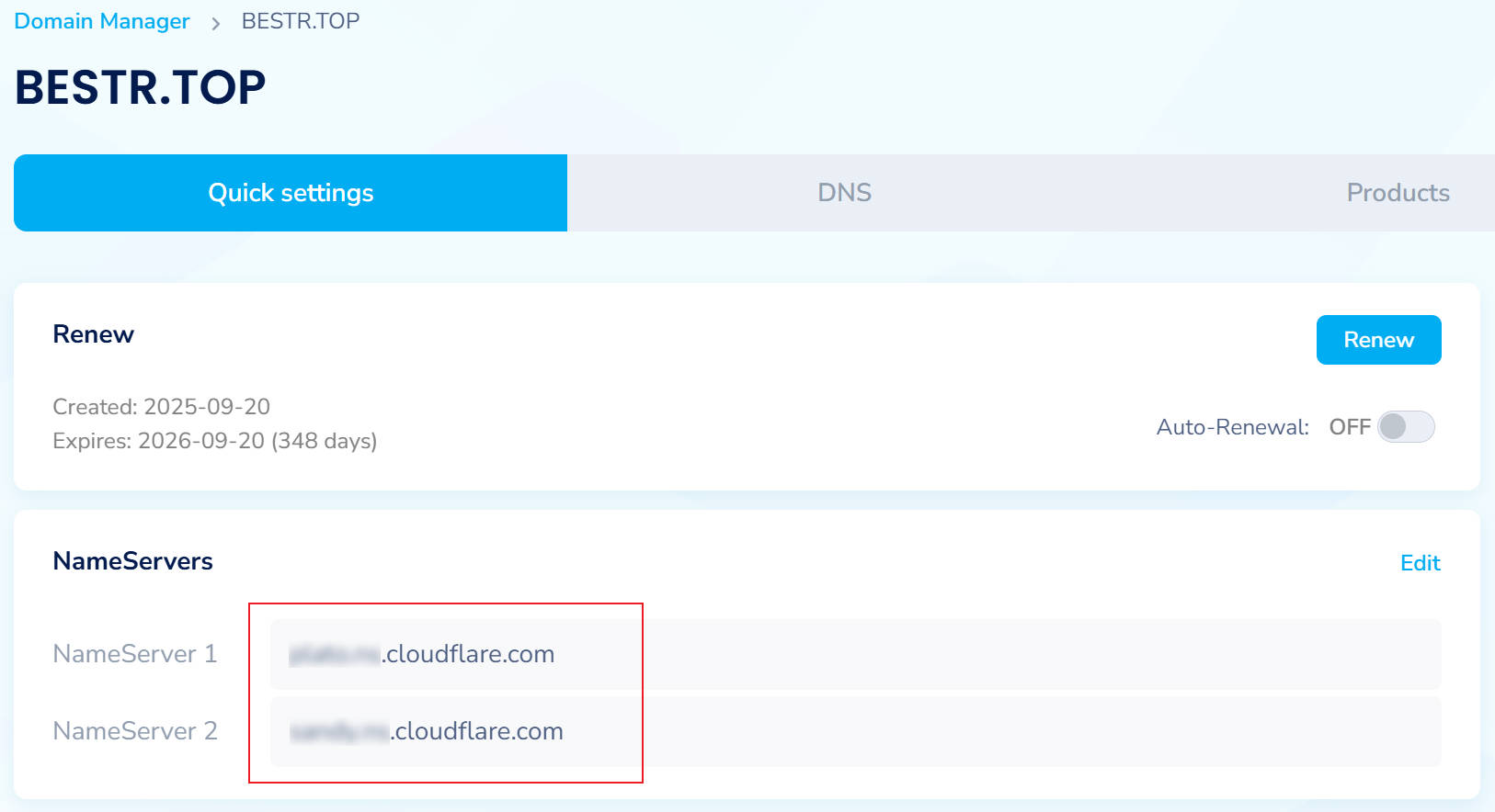将NameSilo中域名的NameServers配置为Cloudflare名称服务器。