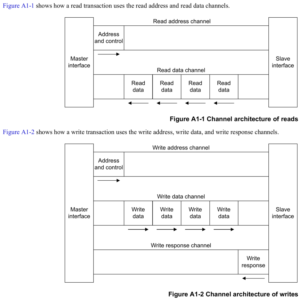 | 读/写地址通道 | 读/写事务都有自己的地址通道,地址通道携带传输事务所需的所有地址和控制信息 |