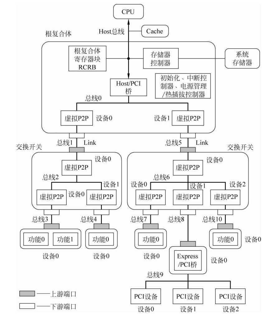 Host总线通过Host/PCI桥引出一条虚拟PCI总线,该总线与根复合体各个下游端口下方的PCI Express链路(也视为一条总线)之间是一个虚拟PCI-PCI桥(记为P2P),此例中,根复合体有两个下游端口,故根复合体内有两个虚拟PCI-PCI桥。